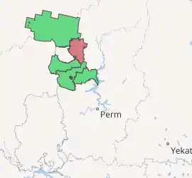 Kosinsky District (Russian: Косинский райо́н) is an administrative district (raion) of Komi-Permyak Okrug of Perm Krai, Russia; one of the thirty-three in the krai.[1] Municipally, it is incorporated as Kosinsky Municipal District.[5] It is located in the northwest of the krai. The area of the district is 3,462 square kilometers (1,337 sq mi).[2] Its administrative center is the rural locality (a selo) of Kosa.[1] Population: 7,246 (2010 Census);[3] 8,541 (2002 Census);[7] 10,615 (1989 Census).[8] The population of Kosa accounts for 32.9% of the district's total population.[3]
