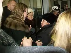 On February 28, during the first debate with several candidates, Sobchak chastised Vladimir Zhirinovsky for interrupting Sergey Baburin. In reply, Zhirinovsky angrily uttered expletives at Sobchak (reportedly, amongst other pejoratives, calling her a "fucking whore" and a "crazy bitch").[29] In response, Sobchak threw water at Zhirinovsky.[29][30] On March 4, while she was campaigning in Moscow in sub-zero temperatures, Sobchak was drenched with water by a supporter of Zhirinovsky, who was intending to retaliate for Sobchak's interaction with Zhirinovsky at the debate.[29]