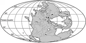 The Kupferschiefer was deposited in a highstand setting,[3] in a deep enclosed basin, covered by the Zechstein sea that was present on the paleocontinent Laurussia, the northern part of Pangea.[10] The basin possibly had periodic connections to the Paleo-Tethys Ocean.[11] Sedimentation rates during Kupferschiefer deposition were low, estimated at 5 millimetres (0.20 in) per thousand years.[12]