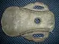 Shita-kura or hadazuke, the twin set of double leather pads attached to the bottom of a Japanese saddle tree (kurabane). The shita-kura (hadazuke) protects the back of the horse from the kurabane.