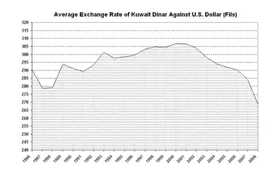 From 18 March 1975 to 4 January 2003, the dinar was pegged to a weighted currency basket. From 5 January 2003 until 20 May 2007, the pegging was switched to 1 US dollar = 0.29963 dinar with margins of ±3.5%.[11] The central rate translates to approximately 1 KWD = US$3.53