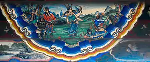 [...] a lofty and dignified look, a majestic and awe-inspiring bearing, wielding a fangtian huaji,[lower-alpha 2] [...] hair pulled back and worn in a golden headdress, donning a flowery-patterned battle robe, encased in body armour decorated with images of the ni,[lower-alpha 3] wearing a precious belt adorned with the image of a lion, [...][3]