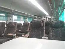 The coaches are designed for an operating speed up to 160 km/h and could go up to 200 km/h.[6] However, they have been tested up to 180 km/h. Their length of 23.54 m and a width of 3.24 m means a higher passenger capacity, compared to conventional rakes.[7] The tare weight of the AC chair car was weighed as 39.5 tonnes.[8] They are considered to be "anti-telescopic", which means they do not get turned over or flip in case of a collision (chiefly head-on). These coaches are made of stainless steel and the interiors are made of aluminium which make them lighter as compared to conventional rakes.[9] Each coach also has an "advanced pneumatic disc brake system" for efficient braking at higher speeds, "modular interiors" that integrate lighting into ceiling and luggage racks with wider windows.[10] The improved suspension system of LHB coaches ensures more riding comfort for the passengers compared to conventional rakes. The air conditioning system of the LHB coaches is of higher capacity compared to the older rakes and is controlled by a microprocessor which is said to give passengers better comfort than the older coaches during summer and winter seasons. They are relatively quieter as each coach produces a maximum noise level of 60 decibels while conventional coaches can produce 100 decibels.