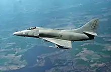 The United States delegation to NATO was worried with Portugal's capability in contributing to NATO operations and felt that the intention to purchase either the F-4E Phantom II or the F-5E Tiger II to replace the F-86F Sabre was inappropriate given that it felt that the A-7D Corsair II or the A-4N Skyhawk provided a better platform for the Portuguese role in an eventual conflict with the Warsaw Pact, which was to mainly protect the Atlantic Ocean resupply routes from the United States to Europe.[20] Additionally, in case of an escalation of the Cold War, the air defense of Portugal and of the Iberian Peninsula was assigned to the Spanish Air Force and the United States Air Force's 401st Tactical Fighter Wing based at Torrejon Air Base, Spain.[21] In this context, both the Skyhawk and Corsair II were better suited for the naval attack role.