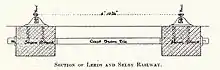 Described as track with longitudinal bearers with cross ties, ladder track type was common on early British railways (c.1830/40s), including the Birmingham and Gloucester Railway, Dublin and Kingstown Railway, Glasgow, Paisley, Kilmarnock and Ayr Railway, Great Western Railway (see Baulk road), Ulster Railway, Newcastle and North Shields Railway, Slamannan Railway (part of), Hull and Selby Railway (two thirds of), Manchester and Bolton Railway (including lontudinal stone sleepers), and the London and Greenwich Railway (partly).[2] On the Hull and Selby Railway it was used in part as it was noted to produce smooth running, and low wheel wear.[3] However the contact between rail and sleeper produced hydraulic pumping in wet conditions, which led to rolling stock becoming dirtied very quickly. The longitudinal track was also found to cause issue with wheel slip on inclines, and to be noticeably inferior to transverse sleepered track in terms of traction.[4] No longitudinally laid track remained on the line after 1860.[3]