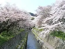 The area of this lake is about 670 km² (258.69 sq mi).[6] Small rivers drain from the surrounding mountains into Lake Biwa, and its main outlet is the Seta River, which later becomes the Uji River, combining with the Katsura and Kizu to become the Yodo River and flows into the Seto Inland Sea at Osaka Bay.