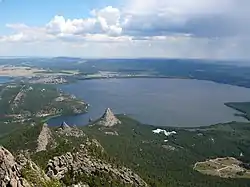 The lake has several capes. Near the northwestern cape, there is a rocky mushroom-shaped island, Zhumbaktas ("Sphinx"), reaching an elevation of 20 metres (66 ft) above the water. Burabay is separated by mountain ranges from the closest lakes. The cliffs and capes of the northwestern and southern coasts create a unique landscape.[2]