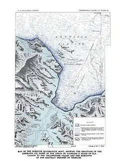 | Primary outflows | Over the divide to the Yellowstone River or along the face of the Ice sheet. |