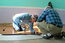 Laminate floors are reasonably easy for a DIY homeowner to install. Laminate flooring is packaged as a number of tongue and groove planks, which can be clicked into one another. Sometimes a glue backing is provided for ease of installation. Installed laminate floors typically "float" over the sub-floor on top of a foam/film underlayment, which provides moisture- and sound-reducing properties. A small (1–10 millimetres (0.039–0.394 in)) gap is required between the flooring and any immovable object such as walls, this allows the flooring to expand without being obstructed. Baseboards (skirting boards) can be removed and then reinstalled after laying of the flooring is complete for a neater finish, or the baseboard can be left in place with the flooring butted into it, then small beading trims such as shoe moulding or the larger quarter-round moulding can be fitted to the bottoms of the baseboards. Saw cuts on the planks are usually required at edges and around cupboard and door entrances, but professional installers typically use door jamb undercut saws to cut out a space to a height that allows the flooring to go under the door jamb & casing for a cleaner look.