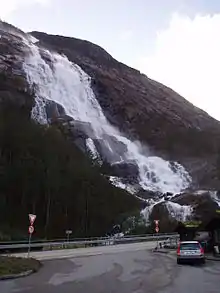 Langfossen is a waterfall located in Etne Municipality in Vestland county, Norway. The waterfall is located about 5 kilometres (3.1 mi) southwest of the village of Fjæra. The water falls down a towering mountain, a total distance of about 612 metres (2,008 ft) before the water leaps out into Åkrafjorden at the base of the mountain. European route E134 runs along the base of the waterfall, making access very easy.