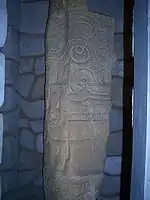 The Lanzón is a granite stela that is associated with the Chavín culture.[1] It is located in the Old Temple of Chavin de Huantar which rests in the central highlands of Peru. The Chavín religion was the first major religious and cultural movement in the Andes mountains, flourishing between 900 and 200 BCE. The Lanzón itself was erected during the Early Horizon period of Andean art circa 500 BCE[2] and takes its name from the Spanish word for "lance," an allusion to the shape of the sculpture.[3] The name is deceiving, as its form more closely resembles a highland plow which would have been used for agricultural purposes at the time.[4] It is suspected because of this that the deity depicted is linked to agrarian worship.