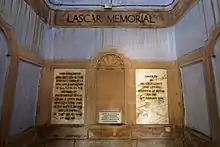 The Lascar War Memorial was erected by shipping and mercantile companies, in the memory of the 896 Lascars of undivided Bengal and Assam who lost their lives during World War I.[5] The monument is situated at the southern end of the Maidan, on Naiper Road, Hastings, near Prinsep Ghat. The 100 feet high monument was unveiled by Lord Lytton, then Governor of Bengal on 6 February 1924. The monument, built in typical Oriental style, is a four-sided column, having designs reflecting the prow of an ancient galley on each side of the column. The upper part of the monument consists of four small minarets and a large gilt dome. A typical Indian look has been given by adding wavy lines beneath the projected balcony, which symbolises waves, along with chhajjas and trellises.[3] The Lascar War Memorial has similarities with the victory tower of Chittor.[1] The memorial built in the Indo-Mughal style by William Ingram Keir, who also designed the Kidderpore Bridge, buildings at Bengal Engineering and Science University in Shibpur, the Indian Institute of Technology, Kharagpur, and Islamia College, and also replaced the 1934 earthquake affected spire of St. Paul's Cathedral, Kolkata with a tower. William Ingram Keir won a prize of Rupees 500 for designing the memorial.[2] The inside of the Memorial is approached through a huge doorway on the Northern wall. The interior contains three plaques below the inscription "Lascar Memorial." One plaque commemorates the unveiling of the memorial by Lytton. The second plaques says that the memorial was erected by shipping and mercantile community of India in memory of the 896 seamen of Bengal Assam and upper India (the term Lascar is not used) who lost their lives in service of the British Empire in the great war of 1914 – 18. The third smaller plaques tells about the renovation and lighting of the Lascar War Memorial.