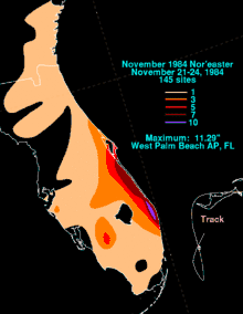 The Late November 1984 Nor'easter occurred on the United States' Thanksgiving Day, November 22, 1984. A deep extratropical cyclone located just off the shore of Florida led to significant beach erosion and the grounding of the freighter Mercedes I for several months along the coastal town of Palm Beach.[1] It formed unusually early, and its effects were seen unusually far south into Florida.