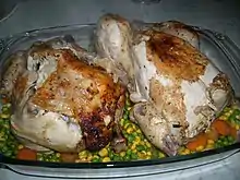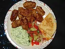 Lebanese cuisine (Arabic: المطبخ اللبناني) is the culinary traditions and practices originating from Lebanon. It includes an abundance of whole grains, fruits, vegetables, fresh fish and seafood. Poultry is eaten more often than red meat, and when red meat is eaten, it is usually lamb and goat meat. It also includes copious amounts of garlic and olive oil, often seasoned with lemon juice. Chickpeas and parsley are also staples of the Lebanese diet.[1][2][3][4]