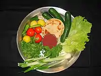 Fattoush (also called "peasants' salad") is made with pita, cucumbers, tomatoes, chickweed, and mint. Tabbouleh is a diced parsley salad with burghul wheat, tomato, mint and served with lettuce, eaten within a mezze or as a standalone dish as a precursor to a main course.[69][70] Yogurt cheese salad consists of shanklish balls (yogurt cheese, feta, chilli powder, thyme, cumin, salt and pepper) added to a freshly prepared salad. It is distinctively Lebanese as is a perfect addition for mezze, complimenting arab and Lebanese wines.[71]