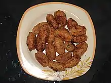 - Kibbeh is a filled bulgur dough made with ground meat and can be made in different forms including fried (Kibbeh raas), uncooked (kibbeh nayyeh), baked (kibbeh bil-saneeya), and all may be served with yogurt.[94][95][96] Some regional versions of kibbeh are a pumpkin-flavoured kebbe lakteen (popular in Beit Mery) and kebbe zghartweih which is an oven-cooked version popular in Ehden.[97][98]