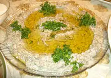 Cheese, of varying origins, as well as yogurt and eggs, are commonly used in Lebanon. One of the more recognizable dishes within Lebanon is the yogurt labneh. Unlike regular yogurt, labneh is strained so as to remove the watery whey, leaving a thicker, creamier consistency. It is spreadable and garnished with olive oil and sea salt.[43] It is an extremely versatile dish that can be served in a mezze platter for either breakfast or dinner. The variant labneh bi toum is mixed with garlic.[43] Ejjeh is the traditional omelette of Lebanon. It is made with egg, chopped parsley and scallions. Within Lebanon, people make this omelette with different herbs that are cultivated from their village.[44][45]
