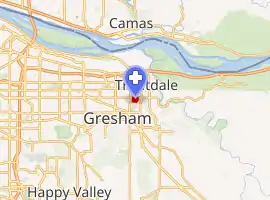 Gresham General Hospital opened in July 1959 in downtown Gresham at a former nursing home that opened in 1934.[1] Gresham General was a private, for-profit facility owned by Ben F. Doerksen and his wife built as a 52-bed facility for a cost of $500,000.[2] Metropolitan Hospitals, parent company for Emanuel Hospital, purchased the hospital in 1971 and renamed it as Gresham Community Hospital,[1][3] and by 1973 it had grown to a 113-bed facility.[4] Earlier in 1971 Emanuel and several other hospitals joined to form Metropolitan Hospitals, which in 1989 became Legacy Health through another merger.[3] In November 1984, Gresham's hospital moved to its current location on Southeast Stark Street in 1984, when it was renamed as Mount Hood Medical Center.[5] The new $15.6 million facility was five stories and had 107 beds.[5]