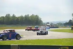 Legends car racing is a style of auto racing designed primarily to promote exciting racing and to keep costs down. The race car bodyshells are 5/8-scale replicas of American automobiles from the 1930s and 1940s, powered by a Yamaha XJ1250, FJ1200 (both air-cooled), or starting in 2018, FZ09 (water-cooled) engine. The worldwide sanctioning body for legends car racing is INEX.