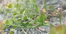 Lepidium oblongum is an annual herb with a small, branching stem up to 20 or 30 centimeters (8-12 inches) long and coated with hairs. The well-spaced leaves are divided into narrow lobes. The inflorescence is a raceme of tiny flowers made up just of sepals; there is occasionally a vestigial petal mixed in. The flowers yield fruits which are notched capsules 2 or 3 millimeters long. There are two varieties of this plant; one, var. insulare, is known only from coastal California and Baja California.[7]