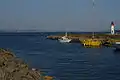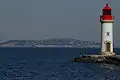 The Les Onglous Lighthouse is the terminating point of the Canal du Midi where the canal enters the Étang de Thau.[2][3] The red and white lighthouse is at the tip of a short jetty projecting into the Étang de Thau. It is located on the east jetty at the canal entrance, about 1.5 km (0.93 mi) south of Marseillan in the Hérault department. The Isthmus of Onglous is a narrow strip of land between the Étang and the Mediterranean.[4]