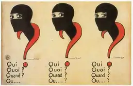 Early advertising for Les Vampires was done mysteriously; in November 1915, the walls of Paris were plastered with street posters that depicted three masked faces with a question mark as a noose, and the questions "Qui? Quoi? Quand? Où…?" ("Who? What? When? Where…?") to advertise the first two episodes (released on the same day). Subsequent posters were made for the later episodes. The morning newspapers printed the following poem: