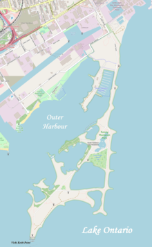 The Spit is a man-made landfill that began in the 1950s when the Toronto Harbour Commission began a project to create a breakwater for Toronto's Outer Harbour. It was part of a plan to expand the capacity of the harbour in anticipation of an expected increase in shipping traffic on the Great Lakes after the Saint Lawrence Seaway opened in 1959. However, owing to the containerization revolution of the 1960s, cargo traffic began to shift to East Coast ports, and shipping volumes in Toronto fell by almost half between 1969 and 1973.[1] Thus, the need for an outer harbour never arose, and all cargo ships calling at Toronto still use the Inner Harbour, while the Outer Harbour sees only pleasure boat traffic.[2]