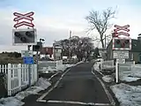 A barrow crossing is one found purely in railway stations which allows passengers, or other through users if it is a public right of way (PROW), the opportunity to cross between platforms. The name derives from the fact that it was used by station staff to carry the luggage of passengers across the tracks on barrows. Some barrow crossings are still in use at stations that do not have footbridges such as at Horton-in-Ribblesdale or at Thirsk, which does have a footbridge, but that footbridge is not accessible to wheelchair users. Some barrow crossings have a light display system of protection telling users when they can and cannot cross, or sometimes the station staff will accompany users.[15][16][17][18]