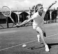 While he was in service, Hoad devised a weight-lifting exercise, doing push-ups with round 50 lb. weights placed on his back, which Hoad later believed probably initiated his back trouble.[97] Hoad left the National Service at the end of April and his third overseas tour with an Australian team started on 5 May.[98] For the first time in his career, Hoad was the top-seeded player at a Grand Slam tournament at the French Championships but he lost in the fourth round to 40-year-old Gardnar Mulloy.[99][100] Hoad lost the doubles final with Rosewall to Seixas and Trabert in 56 minutes. Partnering Maureen Connolly, who had won the women's singles title, Hoad won the mixed-doubles final against Jacqueline Patorni and Rex Hartwig.[101] In June, Hoad overcame countryman Rose in the final of the Queen's Club Championship to successfully defend his title.[102] Hoad was one of the favorites for the Wimbledon Championships and was seeded second behind Trabert.[103] In the fourth round, Hoad avenged his loss to Mulloy at the French Championships, defeating him in four sets.[104] In the quarterfinal the powerful service and excellent returns of 32-year-old Drobný proved too much for Hoad and he was beaten in straight sets within an hour.[105] Hoad and Rosewall were unable to defend their Wimbledon doubles title after losing in fives sets in the semifinal to Seixas and Trabert.[106] A surprise loss against Roger Becker in the semifinal at the Midlands Counties Championships in Birmingham was followed in mid-July by winning the singles title at the Swiss Championships in Gstaad.[107][108] As in the previous year, Hoad met Rosewall in the Eastern Grass Court Championships in August, this time in the final, and again the titleholder was victorious, overpowering Rosewall to win the singles title in three straight sets.[109] At Newport in mid August, Hoad was beaten by 17-year-old compatriot Roy Emerson who won the deciding set 8–6.[110][111] For the third time in 1954, Seixas and Trabert defeated Hoad and Rosewall at a Grand Slam doubles event, winning the U.S. Doubles Championships in Brookline.[112]