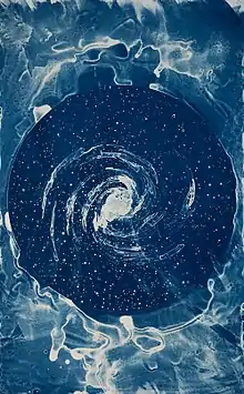 The cyanotypes are created through a scientific and experimental process, by painting the images on semitransparent drafting film. Next, they are pressed on paper glazed with light-sensitive emulsion and exposed to the sun, creating a positive image. This process mimics that of the Harvard Computer's astronomical plates, essentially creating a photographic print without the use of a camera. Stepping away from the often formulaic process of science, Halloran's pieces do not dwell in accuracy, but instead offers an active experience, re-igniting the spirit of the universe.