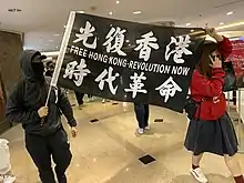 "Liberate Hong Kong, revolution of our times"[1] (Chinese: 光復香港,時代革命; also translated variously) is a slogan used in social movements in Hong Kong. The slogan was first used in 2016 by Hong Kong Indigenous spokesman Edward Leung as his campaign theme and slogan for the 2016 New Territories East by-election. He emphasised that anyone can take part in innovation and change regardless of age, hence the use of the phrase "revolution of our times". In the legislative election held later that year, Youngspiration, which was cooperating with Hong Kong Indigenous as Leung was banned from running by the Electoral Affairs Commission, also used the slogan for their campaign.