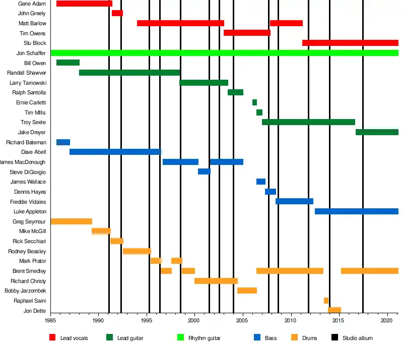 | Lead vocals | Gene Adam | John Greely | Matt Barlow | Tim "Ripper" Owens | Matt Barlow | Stu Block | |||||||