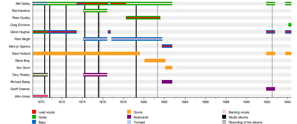 Trapeze were an English rock band from Cannock, Staffordshire. Formed in March 1969, the band originally featured former The Montanas members John Jones (vocals, trumpet) and Terry Rowley (keyboards, guitar, flute), as well as former Finders Keepers members Mel Galley (guitar, vocals), Glenn Hughes (bass, piano, vocals) and Dave Holland (drums).[1] After the band released their self-titled debut album in May 1970, Jones and Rowley left to return to The Montanas.[2] Hughes, Galley and Holland released Medusa later in the year and You Are the Music... We're Just the Band in 1972,[1] before Hughes left to join Deep Purple in June 1973.[3] Prior to his departure, Hughes was due to switch to the role of second guitarist, with Pete MacKie set to take his place on bass;[4] however, this never came to fruition.[5]