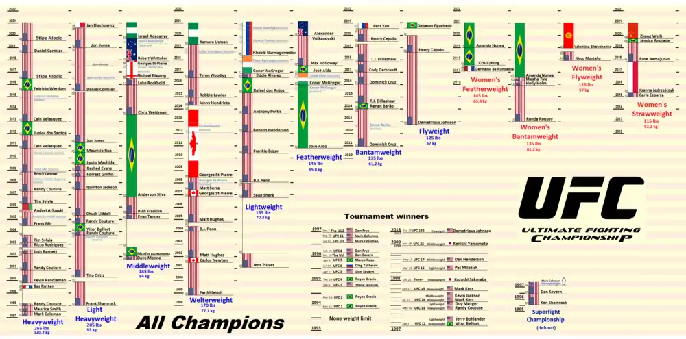 Ultimate Fighting Championship (UFC) champions are fighters who have won UFC championships.[1] At the time of the UFC's inception in 1993, mixed martial arts was not sanctioned in the United States, and did not include weight classes. Instead of the traditional championship model, the UFC held tournaments with the winner receiving a permanent appellation.[2] In response to criticism from Senator John McCain that saw the loss of its television deal and the banning of the sport in thirty-six states, the UFC increased its cooperation with state athletic commissions and introduced weight classes in 1997, starting with UFC 12, and began introducing weight-specific titles.[3]