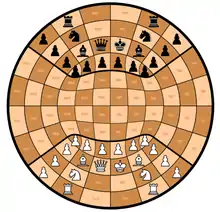 - Circular chess: Played on a circular board consisting of four rings, each of sixteen squares.