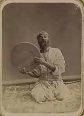 Abbos Kasimov, the premier percussionist from Uzbekistan, is playing his national instrument, the doira.