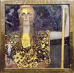 | 07 | ![]() | 1898 – Pallas Athena (oil on canvas, 75 cm × 75 cm) | Enhanced by the golden frame created by Klimt's brother, Georg, the goddess Athena is portrayed in front of a frieze borrowed from a black-figure Attic vase of the 6th century BC. The red hair comes out of the helmet so as to underscore the goddess' femininity, notwithstanding her armour. Following the example of the Munich Secession, Athena is chosen as the patron numen of the Viennese Secession.[2] |