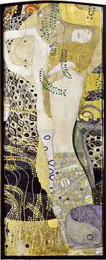 | 16 | ![]() | 1904–1907 – Water Snakes (mixed media on vellum, 50 cm x 20 cm) | Painted by using various techniques, from watercolour to tempera, to using gold leaf on parchment. The composition proposes stretched figures in slender shapes typical of the Jugendstil, but its central motif is the bombastic decoration of the golden period, played in the abstract yet allusive illustration of the embrace and the mosaic of open almonds. |