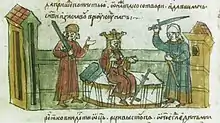 His early rule is characterized by a staunch pagan reaction but in 988 he was baptized into Orthodoxy and successfully converted Kievan Rus' to Christianity. In 987 gave Polotsk to his son Iziaslav. |