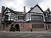 1875 | Originally Brooke's Bank, it curves around a corner, and has a sandstone ground floor with timber framing above, and a clay tile roof. There are two storeys with attics, four bays, and three unequal gables with bressumers, decorative bargeboards and finials. In the second bay is a double-arched entrance with a balustrade and a balcony above. The first and fourth bays have mullioned and transomed windows in the ground floor and oriel windows in the upper floors and attics. The third bay contains a large two-storey curved bay window with eleven lights. On the roof are Tudor-style chimney stacks and a lead bellcote.[17][43] | II |
