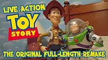 Live Action Toy Story is a 2012 fan film produced by the Arizona-based Jonason Pauley and Jesse Perrotta; it is a shot-by-shot recreation of the 1995 computer-animated film of the same name, with the toy characters animated through stop-motion or filmed moving with wires and strings.[1]