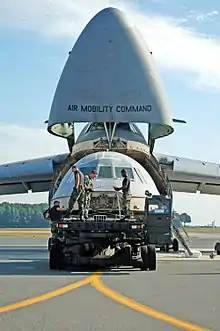 The C-5 has been used for several unusual functions. During the development of the secretive stealth fighter, the Lockheed F-117 Nighthawk, Galaxies were often used to carry partly disassembled aircraft, leaving no exterior signs as to their cargo.[67] The C-5 remains the largest aircraft to operate in the Antarctic,[68] capable of operating from Williams Field near McMurdo Station.[69] The C-5 Galaxy was a major supply asset in the international coalition operations in 1990–91 against Iraq in the Gulf War.[70][71][72] C-5s have routinely delivered relief aid and humanitarian supplies to areas afflicted with natural disasters or crisis; multiple flights were made over Rwanda in 1994.[73] The C-5 is also used to transport Marine One.[74]