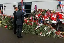 Russian President Dmitry Medvedev, who had been on his way to Yaroslavl for the Yaroslavl Global Policy Forum, sent his condolences to the families of those killed in the crash[42] and visited the crash site along with Governor of Yaroslavl Oblast Sergey Vakhrukov.[2][43] René Fasel, president of the International Ice Hockey Federation, called the crash "the darkest day in the history of our sport."[44] Yaroslavl announced a three-day period of mourning from Friday 9 September 2011 to Sunday 11 September 2011.[21]