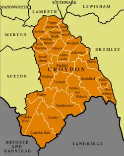 Districts in the London Borough of Croydon include Addington, a village to the east of Croydon which until 2000 was poorly linked to the rest of the borough as it was without any railway or light rail stations, with only a few patchy bus services. Addiscombe is a district just northeast of the centre of Croydon, and is popular with commuters to central London as it is close to the busy East Croydon station.[33] Ashburton, to the northeast of Croydon, is mostly home to residential houses and flats, being named after Ashburton House, one of the three big houses in the Addiscombe area.[34] Broad Green is a small district, centred on a large green with many homes and local shops in West Croydon.[35] Coombe is an area, just east of Croydon, which has barely been urbanised and has retained its collection of large houses fairly intact. Coulsdon, south west of Central Croydon, which has retained a good mix of traditional high street shops as well as a large number of restaurants for its size.[36] Croydon is the principal area of the borough, Crystal Palace is an area north of Croydon, which is shared with the London Boroughs of Lambeth, Southwark, Lewisham and Bromley.[37] Fairfield, just northeast of Croydon, holds the Fairfield Halls[38] and the village of Forestdale, to the east of Croydon's main area, commenced work in the late 1960s and completed in the mid-70s to create a larger town on what was previously open ground.[39] Hamsey Green is a place on the plateau of the North Downs, south of Croydon.[40] Kenley, again south of the centre, lie within the London Green Belt and features a landscape dominated by green space.[41] New Addington, to the east, is a large local council estate surrounded by open countryside and golf courses.[42] Norbury, to the northwest, is a suburb with a large ethnic population.[43] Norwood New Town is a part of the Norwood triangle, to the north of Croydon. Monks Orchard is a small district made up of large houses and open space in the northeast of the borough.[44] Pollards Hill is a residential district with houses on roads, which are lined with pollarded lime trees, stretching to Norbury. Purley, to the south, is a main town whose name derives from "pirlea", which means 'Peartree lea'.[45] Sanderstead, to the south, is a village mainly on high ground at the edge of suburban development in Greater London.[46] Selhurst is a town, to the north of Croydon, which holds the nationally known school, The BRIT School. Selsdon is a suburb which was developed during the inter-war period in the 1920s and 1930s, and is remarkable for its many Art Deco houses, to the southeast of Croydon Centre. Shirley, is to the east of Croydon, and holds Shirley Windmill. South Croydon, to the south of Croydon, is a locality which holds local landmarks such as The Swan and Sugarloaf public house and independent Whitgift School part of the Whitgift Foundation.[47] South Norwood, to the north, is in common with West Norwood and Upper Norwood, named after a contraction of Great North Wood and has a population of around 14,590. Thornton Heath is a town, to the northwest of Croydon, which holds Croydon's principal hospital Mayday.[48] Upper Norwood is north of Croydon, on a mainly elevated area of the borough. Waddon is a residential area, mainly based on the Purley Way retail area, to the west of the borough. Woodside is located to the northeast of the borough, with streets based on Woodside Green, a small sized area of green land.[49] And finally Whyteleafe is a town, right to the edge of Croydon with some areas in the Surrey district of Tandridge.