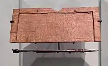 The local waterlogged soil conditions then preserved even organic material like leather shoes[6] and a large assembly of wooden writing tablets of which over 400 were found. The tablets originally held a layer of dark wax and messages were scratched into the wax with a stylus that revealed the paler wood underneath. The wax has perished, but the words were reconstructed from scratch marks left in the wood.[7] Among the messages is the oldest financial document from London, dated AD 57,[8] and two addresses from AD 62 and AD 70 containing the earliest mention of London.[9]
