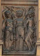 The fire station was built between 1904 and 1906 at a cost of £142,000 (equivalent to £15.4 million in 2021[7]).[8] The building's substructure and foundations were built by C. H. Normanton of Manchester. The superstructure was built by Gerrard's of Swinton at a cost of £75,360.[9] It was faced with red brick and terracotta by Burmantofts, a common choice for early 20th-century buildings in Manchester as it was cleanable and resisted the pollution and acid rain caused by local industry.[9] Other notable Manchester buildings from this era making use of terracotta include the Midland Hotel, the Refuge Assurance Building, the University of Manchester's Sackville Street Building and the Victoria Baths.[10] The building's exterior featured sculptural models by John Jarvis Millson representing the functions of the building such as justice, fire and water.[1][8][11][12][13]