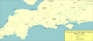 The London and South Western Railway (LSWR or L&SWR[1]) was a railway company in England from 1838 to 1922. Starting as the London and Southampton Railway, its network extended from London to Plymouth via Salisbury and Exeter, with branches to Ilfracombe and Padstow and via Southampton to Bournemouth and Weymouth. It also had many routes connecting towns in Hampshire and Berkshire, including Portsmouth and Reading. In the grouping of railways in 1923 the LSWR amalgamated with other railways to create the Southern Railway.