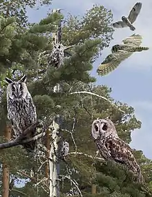 The most easily observed and most dramatic portion of interspecies owl and raptor ecology is interspecific predations. In this regard, long-eared owls are much more often the victims rather than the predators. Their generally successful life history on the contrary often makes long-eared owls perhaps more vulnerable than most other medium-sized owls to predations and even perhaps many smaller owl species. These include nesting in relatively open abandoned bird nests rather than hard to access cavities. Also, long-eared owls tendency to occur in quite open areas whilst hunting coupled with the loud vocalizations (including begging calls of their fledglings) and other auditory displays are all likely to court predators.[3][20][24][75][219] In Europe, their most serious predators tend to be the Eurasian eagle-owl and the northern goshawk (Accipiter gentilis). One account recorded 768 instances of predation by eagle-owls and 317 by goshawks (or 55% of the owl prey for recorded for goshawks in Europe).[3][20][75] Long-eared owls rank in the five most regular predated bird species by eagle-owls in Europe.[75][220][221] Some biologists feel that long-eared owls tendency to avoid richer prey concentrations in favor of opener habitats and spatial usage, especially while migrating and wintering, is partial dictated by the detection of eagle-owl (and perhaps goshawk) activity, so therefore the eagle-owl has a serious influence on the long-eared owl's life history.[3][19][26] In general, long-eared owls endure predation by a formidable array of diurnal birds of prey in Europe. It is likely that largely perch hunting raptor such as Buteo and most eagles may either chance upon an owl roost during a hunting foray or encounter a long-eared owl perhaps during overlapping activity around dawn or dusk, while large falcons are likely to only strike one down when an owl is flushed during daytime. Goshawks and other Accipiter hawks are a particularly deadly threat among diurnal raptors due to their intensive searching hunting methods and willingness to dive into wooded thickets holding roosting owls.[20][75][222][223] Beyond goshawks, diurnal raptors in Europe known to be predators of long-eared owls of potentially any age are known to include golden eagle (Aquila chrysaetos), Bonelli's eagle (Aquila fasciata), eastern imperial eagle (Aquila heliaca), greater spotted eagle (Clanga clanga), lesser spotted eagle (Clanga pomarina), black kite (Milvus migrans), red kite (Milvus milvus), white-tailed eagle (Haliaeetus albicilla), common buzzard, rough-legged buzzard (Buteo lagopus), peregrine falcon (Falco peregrinus), saker falcon (Falco cherrug) and even (in two cases) the slightly smaller Eurasian sparrowhawk (Accipiter nisus).[3][75][224][225][226][227][228][229][230] Other than eagle-owls, tawny owls and Ural owls (Strix uralensis) regularly kill long-eared owls where their ranges meet, though in some cases these may begin as territorial attacks by the Strix owls, the smaller long-eared may be consumed regardless.[3][75]