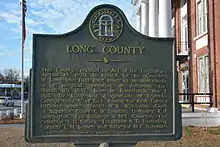 Long County is a county located in the U.S. state of Georgia. The county seat is Ludowici.[1] Long County is part of the Hinesville-Fort Stewart Metropolitan Statistical Area. The constitutional amendment to create the county was proposed August 14, 1920, and ratified November 2, 1920. The county is named after Crawford Long (1815–1878), American surgeon and pharmacist, first to use diethyl ether as an anaesthetic.[2]