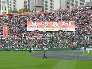 The Giants are the most popular team in the Korea Baseball Organization league.[10] According to a Gallup Korea's survey conducted in 2011, the Giants were chosen as the most popular team three times in a row.[10] They attracted over 1 million fans to Sajik Baseball Stadium in 1991 for the first time in league history. In the 2009 season, they set the all-time record of home attendance of 1,380,018 fans.[3] In the 2011 season, they also led the league in the total home attendance with 1,358,322 fans at 67 home games.[11] The average attendance was 20,273 fans per game, meaning the stadium was 71 percent full on average per game.[11] From 2008 to 2011, they drew over 1 million fans four years consecutively, which was the first time in Korean professional baseball history.